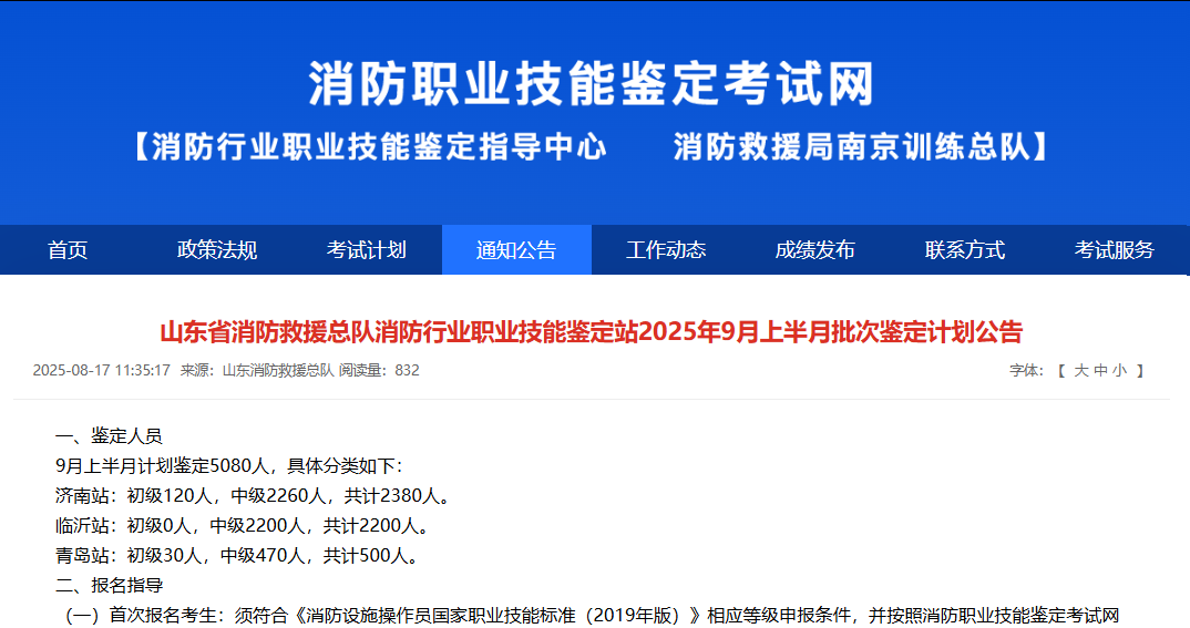 山东省消防救援总队消防行业职业技能鉴定站2025年9月上半月批次鉴定计划公告